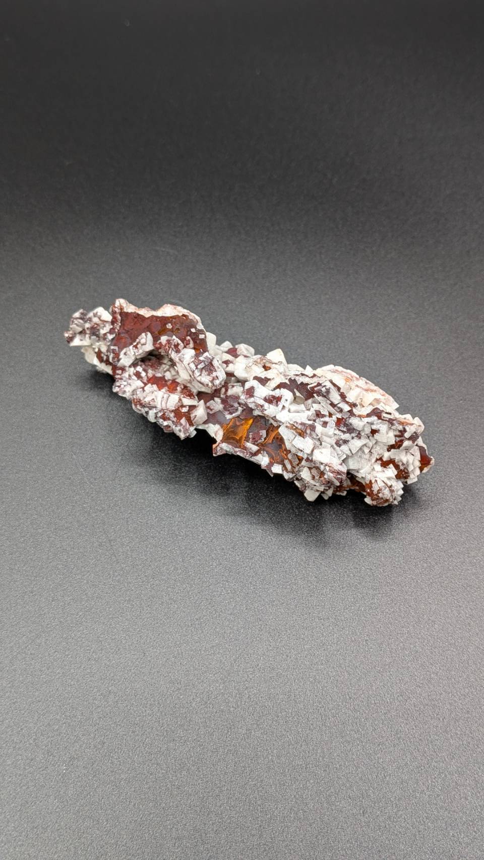 赤褐色のゲータイト母岩上に、白色の板状カルサイト結晶が密集しており、