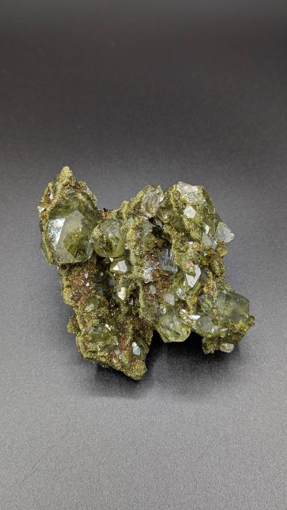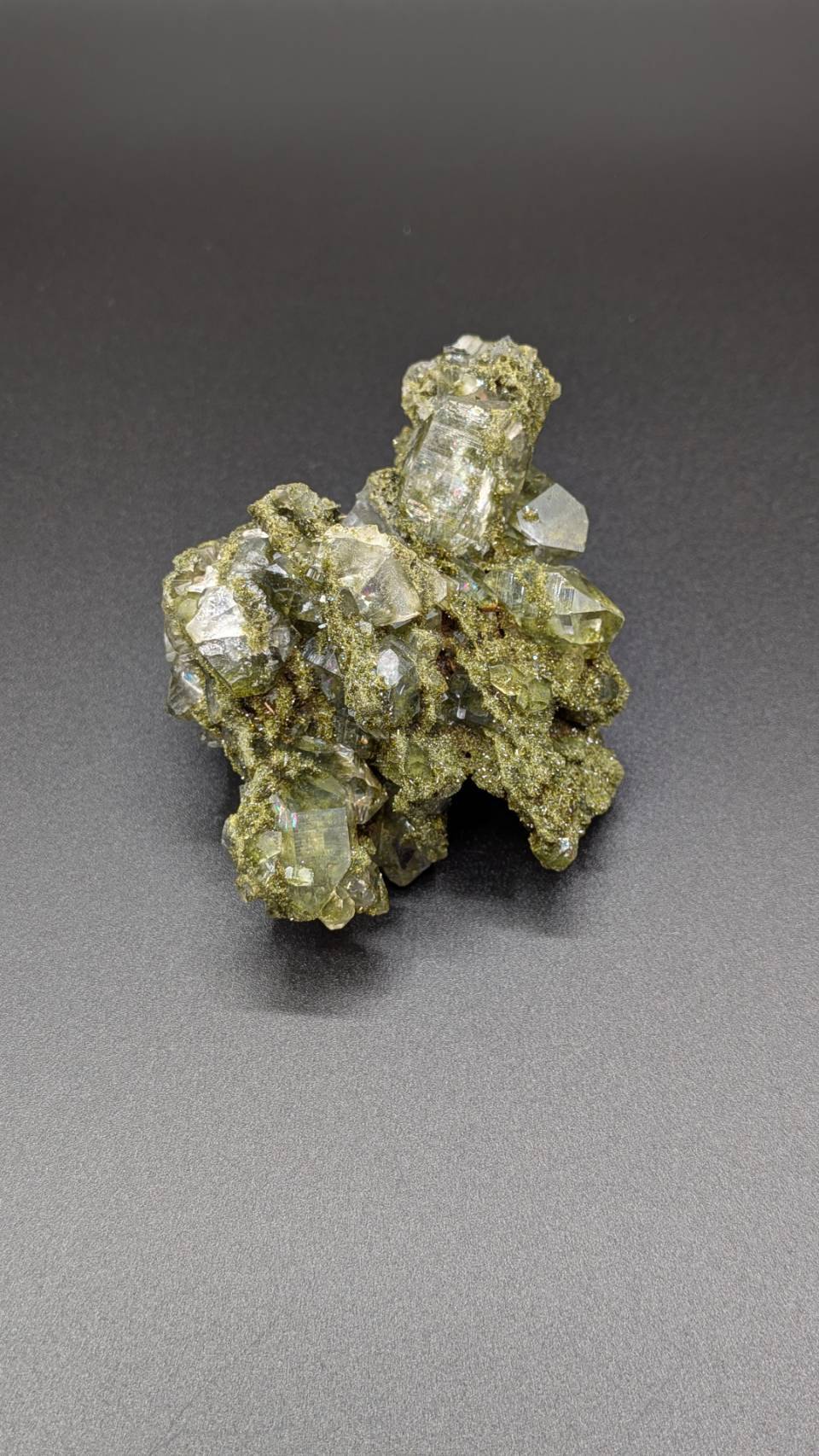 立体的に発達したエピドート結晶とクォーツが共生し、