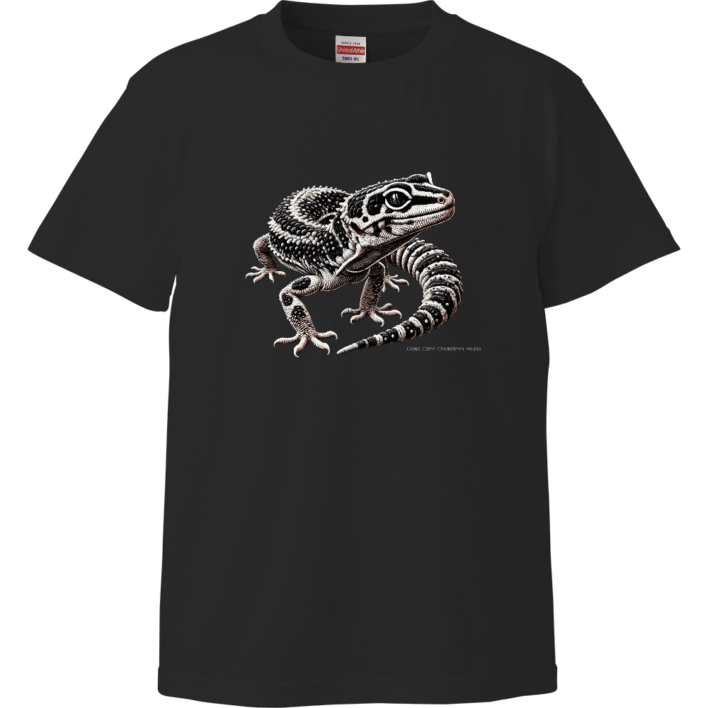 フロントには、繊細な刺繍風デザインでリアルに描かれた レオパードゲッコー(Eublepharis macularius) をプリント。